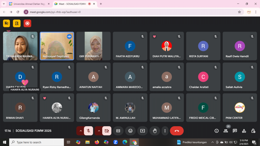 Yogyakarta — PKM Center Universitas Ahmad Dahlan (UAD) mengadakan kegiatan sosialisasi Program Pembinaan Mahasiswa Wirausaha (P2MW) 2025 pada 04 Februari 2025. Acara ini berlangsung secara daring melalui gmeet dan dihadiri oleh mahasiswa dari berbagai program studi di Universitas Ahmad Dahlan.